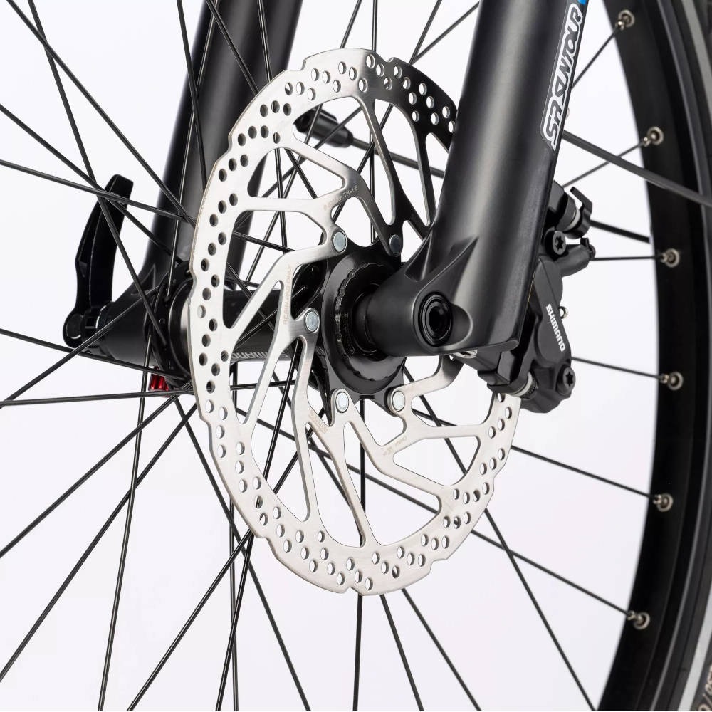 Podstawę e-bike’a stanowi starannie wykonana aluminiowa rama (ze stopu 6061). Materiał ten jest nie tylko trwały, ale również lekki. Wariant określany przez producenta jako High ma klasyczną geometrię, z wysoko poprowadzoną górną rurą ramy – dla miłośników bardziej sportowego designu. Aby jednoślad radził sobie w czasie trekkingu na każdym podłożu – dysponuje amortyzowanym widelcem SR Suntour Mobie 34 2CR. Jego skok wynosi aż 80 mm, więc gwarantuje efektywne tłumienie wstrząsów od podłoża.
