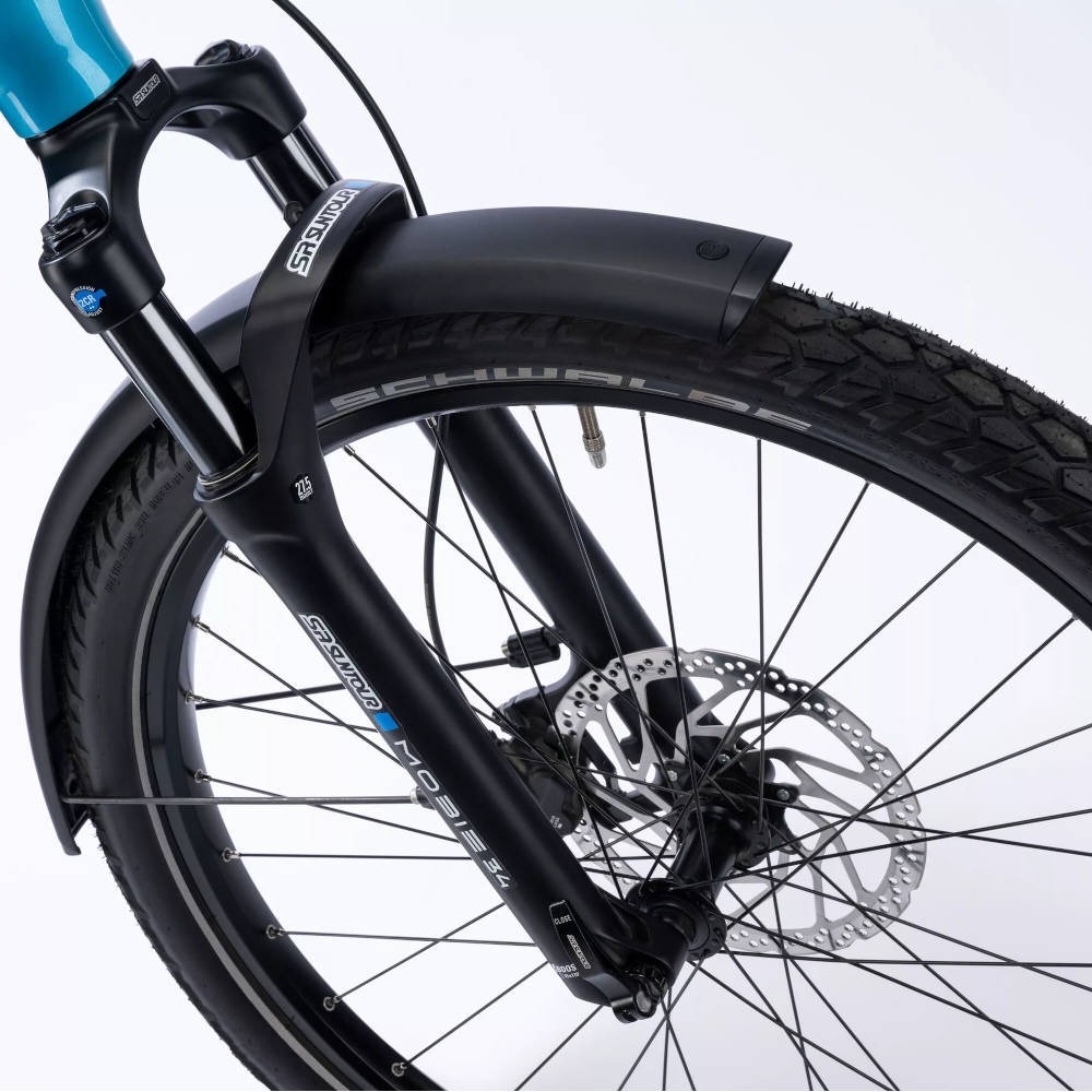 Podstawę e-bike’a stanowi starannie wykonana aluminiowa rama (ze stopu 6061). Materiał ten jest nie tylko trwały, ale również lekki. Wariant określany przez producenta jako Low ma innowacyjną geometrię, całkowicie pozbawioną górnej rury ramy, co ułatwia wsiadanie i zsiadanie, a także obniża środek ciężkości roweru, czyniąc go stabilniejszym. Aby jednoślad radził sobie w czasie trekkingu na każdym podłożu – dysponuje amortyzowanym widelcem SR Suntour Mobie 34 2CR. Jego skok wynosi aż 80 mm, więc gwarantuje efektywne tłumienie wstrząsów od podłoża.