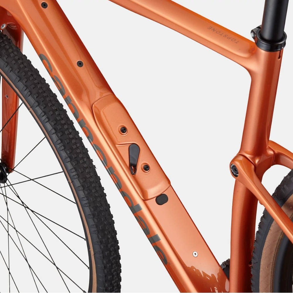 Podstawą roweru gravelowego Cannondale Topstone Carbon 3 GRX 2x12 jest rama w całości wykonana z włókna węglowego – lekka, a przy tym niezwykle wytrzymała i dobrze amortyzująca. Współpracuje ona z opatentowanym tylnym zawieszeniem Kingpin, które tłumi drgania i zwiększa komfort, szczególnie podczas długich godzin w siodle i jazdy z obciążeniem. Konstrukcja ramy została opracowana również pod kątem funkcjonalności: znajdziesz tu wiele punktów montażowych na bidony i torby, a prześwit na szersze niż standardowe opony daje Ci swobodę wyboru ogumienia – od szybkich gravelówek po modele terenowe.
