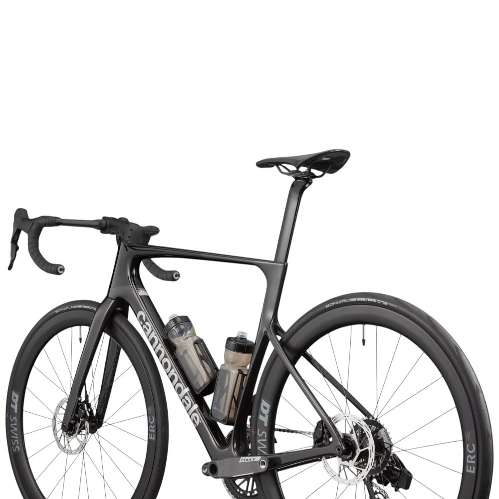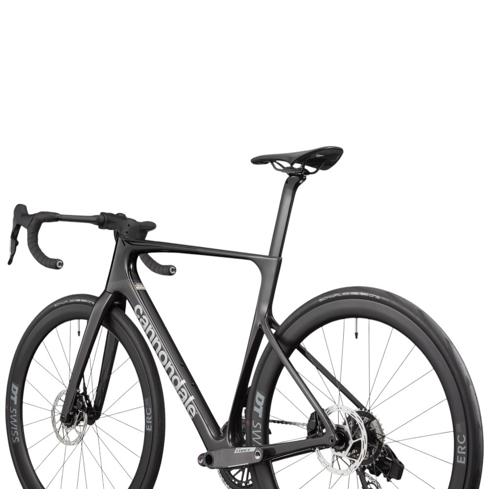 Warto zwrócić uwagę na zastosowany zestaw kół (przystosowany do użytku bezdętkowego). Cannondale SuperSix EVO 3 ma na wyposażeniu lekkie obręcze z włókna węglowego DT Swiss ERC 45 oraz opony Schwalbe One TLR – łączące przyczepność z wysoką trwałością i odpornością na przebicia.