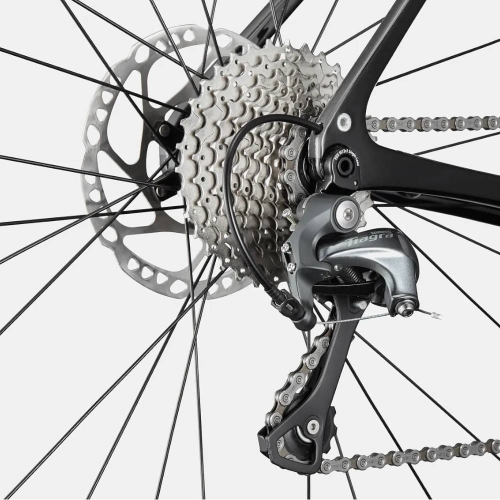 Osprzęt umieszczony w niniejszym rowerze szosowym to grupa Tiagra od japońskiego producenta Shimano. 10-biegowy napęd spokojnie poradzi sobie podczas jazdy po zróżnicowanym terenie, a hydrauliczne hamulce tarczowe zawsze zatrzymają Cię na czas, w razie takiej potrzeby – nawet w czasie wyjątkowo ulewnego deszczu!