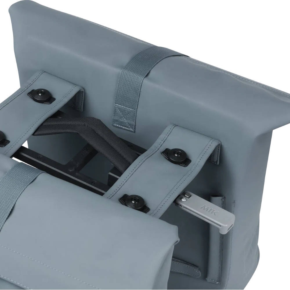 Sakwy Basil City MIK wyprodukowano z poliuretanu hydrofobowego, a ich pojemność wynosi do 32 l (2 x 16 l). Wykorzystany materiał sprawia, że przewożone w torbach przedmioty nie zamokną, więc nie musisz obawiać się nagłego pogorszenia pogody na trasie. Zwłaszcza że sakwy dysponują składanym zapięciem na rzep, będącym dodatkowym zabezpieczeniem przed wodą i brudem.