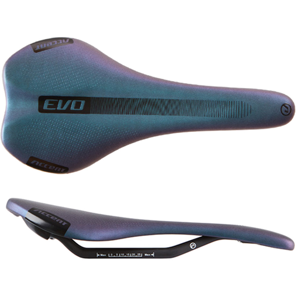 Superlekkie sportowe siodełko Accent Evo Carbon z topowej linii komponentów Evo sprawdzi się zarówno na szosę, jak i do MTB. Pokrycie wykonane z microfibry zapewnia trwałość, odporność na ścieranie, a dodatkowo pozostaje wysoce oddychające. Doskonale dopasowuje się do ciała zapewniając komfort podczas jazdy. Siodełko wypełnione zostało bardzo lekką pianką, a zastosowane karbonowe pręty zapewniają niską wagę.