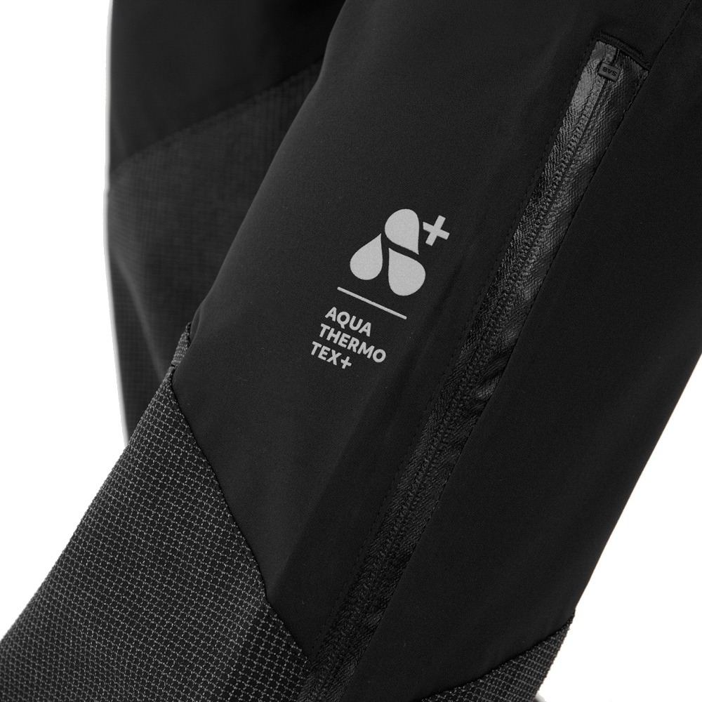 Zastosowana w spodniach membrana Aqua Thermo TEX+ jest wysoce wodoodporna i wiatroszczelna. Cechą charakterystyczną dla tej membrany jest połączenie niskiej wagi, co wpłynie na komfort użytkowania oraz wysokich parametrów paro przepuszczalności. Odporność na deszcz wynosi aż 15 000 mm, więc spodnie będą stanowiły doskonałą barierę przed największymi opadami, zachowując przy tym wysoki poziom oddychalności. Dodatkowo wszystkie szwy zostały podklejone, a zamki są wodoodporne.