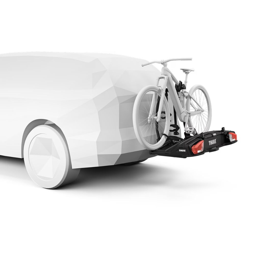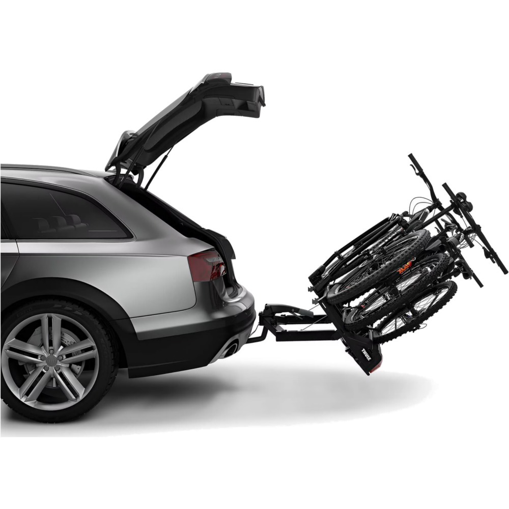 Zapomnij o skomplikowanych systemach instalacyjnych – Thule VeloSpace XT3 to synonim wygody. Uchwyt z gałkami Thule AcuTight umożliwia błyskawiczne i pewne zamocowanie rowerów, a specjalny klik sygnalizuje poprawność montażu. Regulacja bagażnika na kuli haka holowniczego również jest wyjątkowo intuicyjna. Co więcej, system uchylny sterowany pedałem zapewnia łatwy dostęp do bagażnika samochodowego, nawet przy zamontowanych rowerach. Dzięki szerokiemu kątowi uchylenia otworzysz bez trudu duży bagażnik, co czyni ten model idealnym na długie podróże i krótkie wypady.