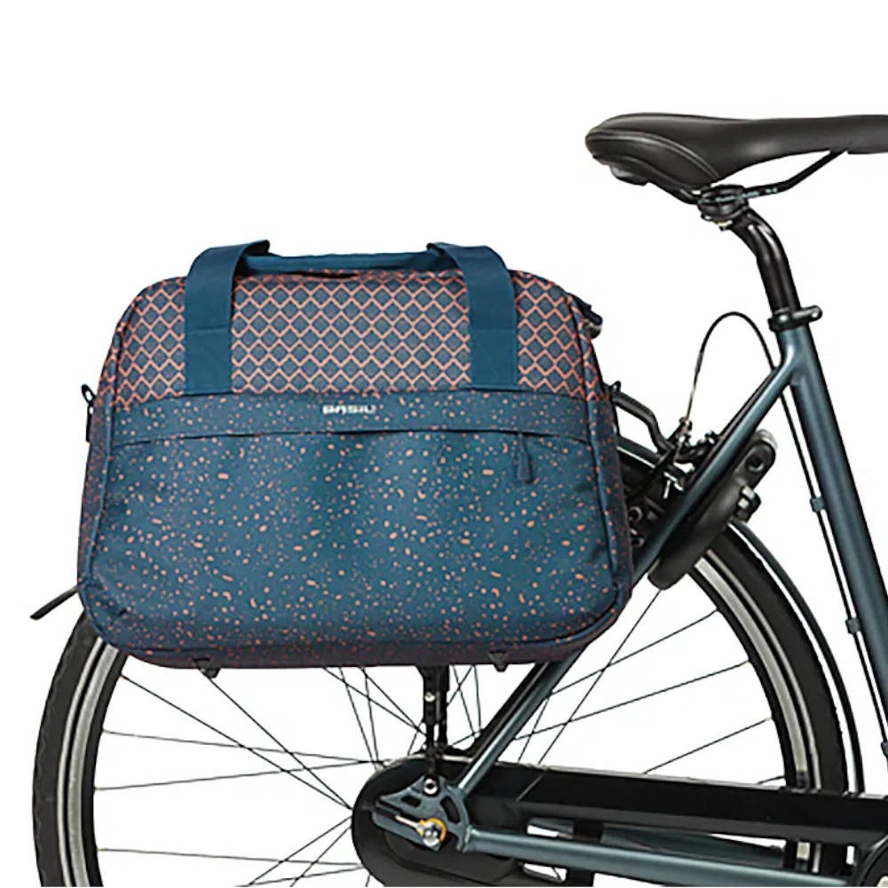 Torba na bagażnik Basil Flair ma pojemność wynoszącą 18 l, co wystarczy, aby przechowywać w niej wszystkie codzienne przedmioty. Wyprodukowana jest z wodoodpornego poliestru, więc kiedy zaskoczy Cię deszcz, nie musisz martwić się, że bagaż od razu zamoknie. Do tego wykorzystany poliester pochodzi z recyklingu, więc wybierając Basil Flair wpierasz troskę o Ziemię. Torba zamykana jest na suwak oraz ma odblaskowe detale, dzięki którym będziesz lepiej widoczny dla innych uczestników ruchu drogowego.
